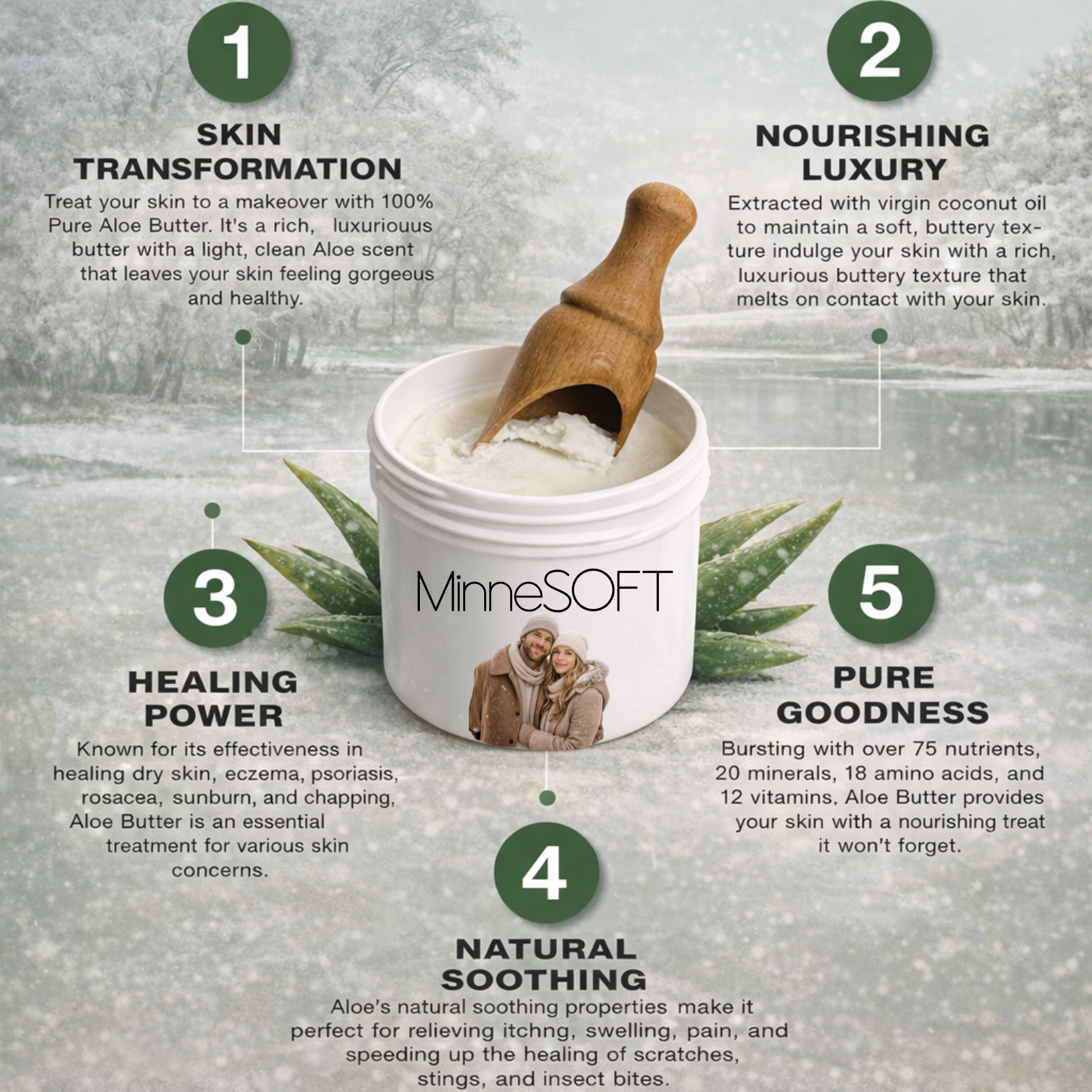 Harsh wind, biting cold, and dry indoor heat — Minnesota winters are tough on your skin. Minnesoft was made to fight back. This ultra-gentle, deeply hydrating aloe butter blends aloe vera and coconut oil into a whipped balm that melts into your skin and gets to work fast.
